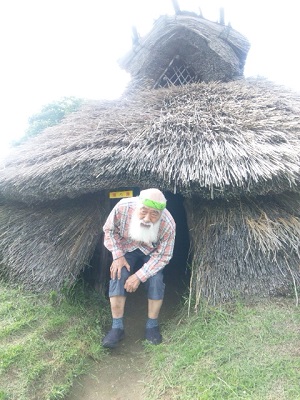 縄文式住居から出てこられる、博山先生。