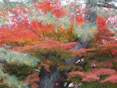 松の木と紅葉が重なり合い、とても綺麗な光景でした。